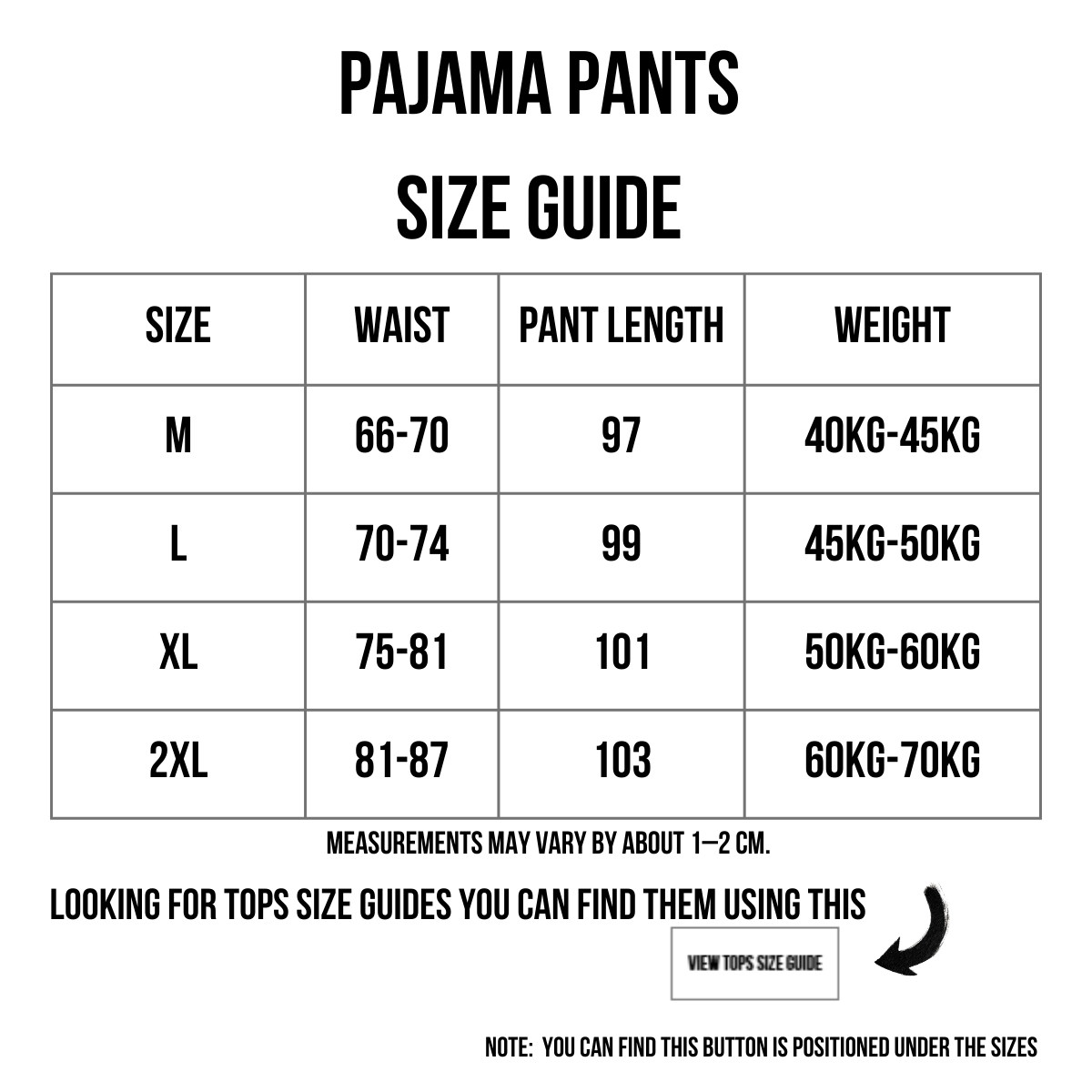 All measurements are in centimeters (CM). Measurements may vary by 1–2 cm due to manual measurement.